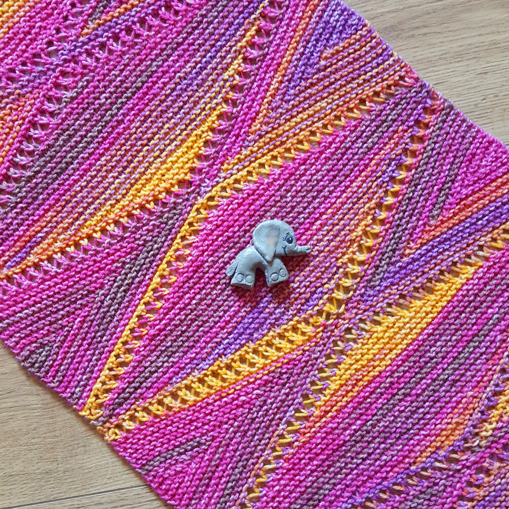 Add a sparkle of color to your spring outfit with this light and playful scarf. It is easy to knit because it consists of garter stitch short rows alternated with a lace pattern. As with nearly all short row patterns, it’s great to show off your variegated yarn.