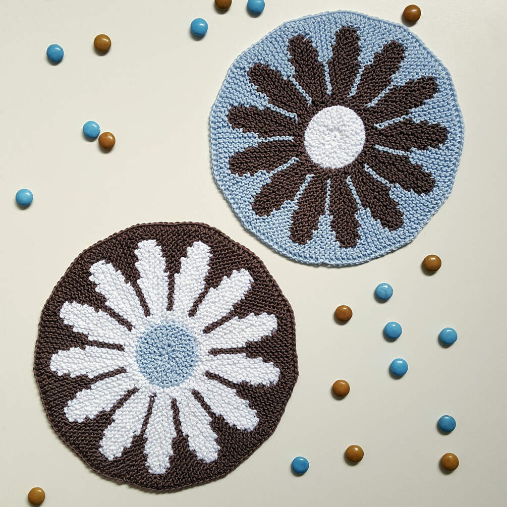 Here is a knitting pattern for a circular potholder with a flower motif – an idea that I had for quite a while.